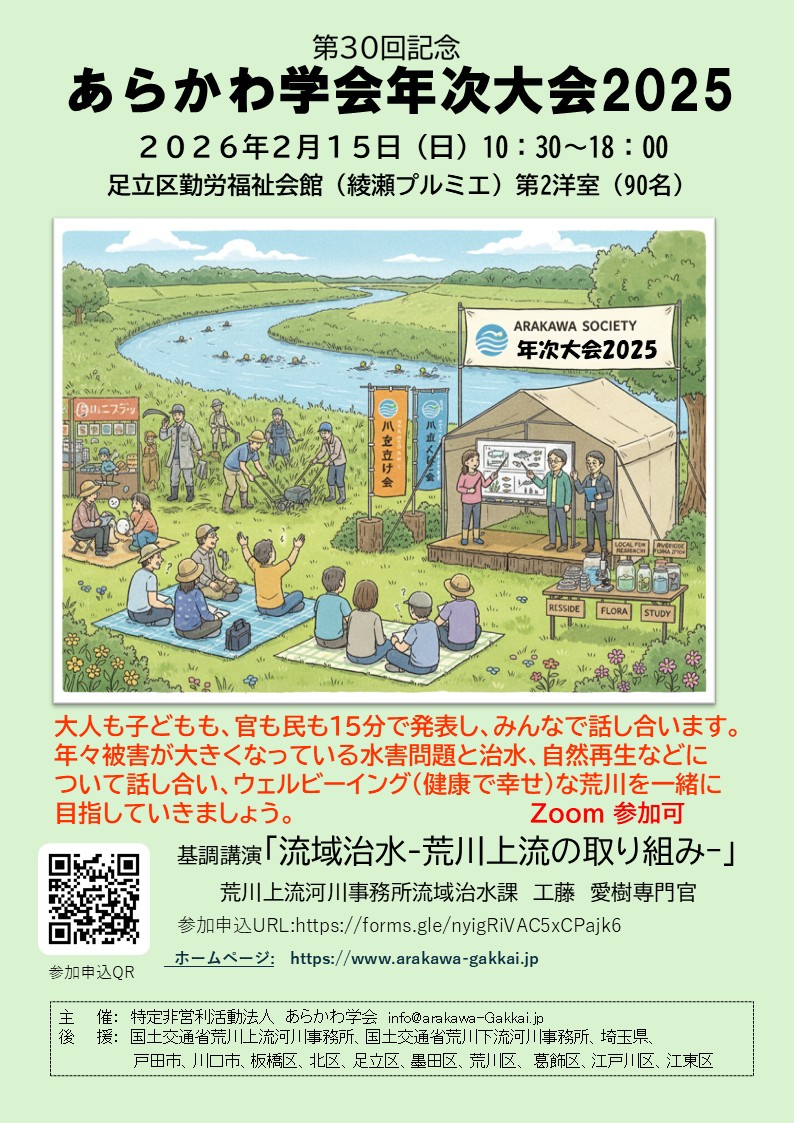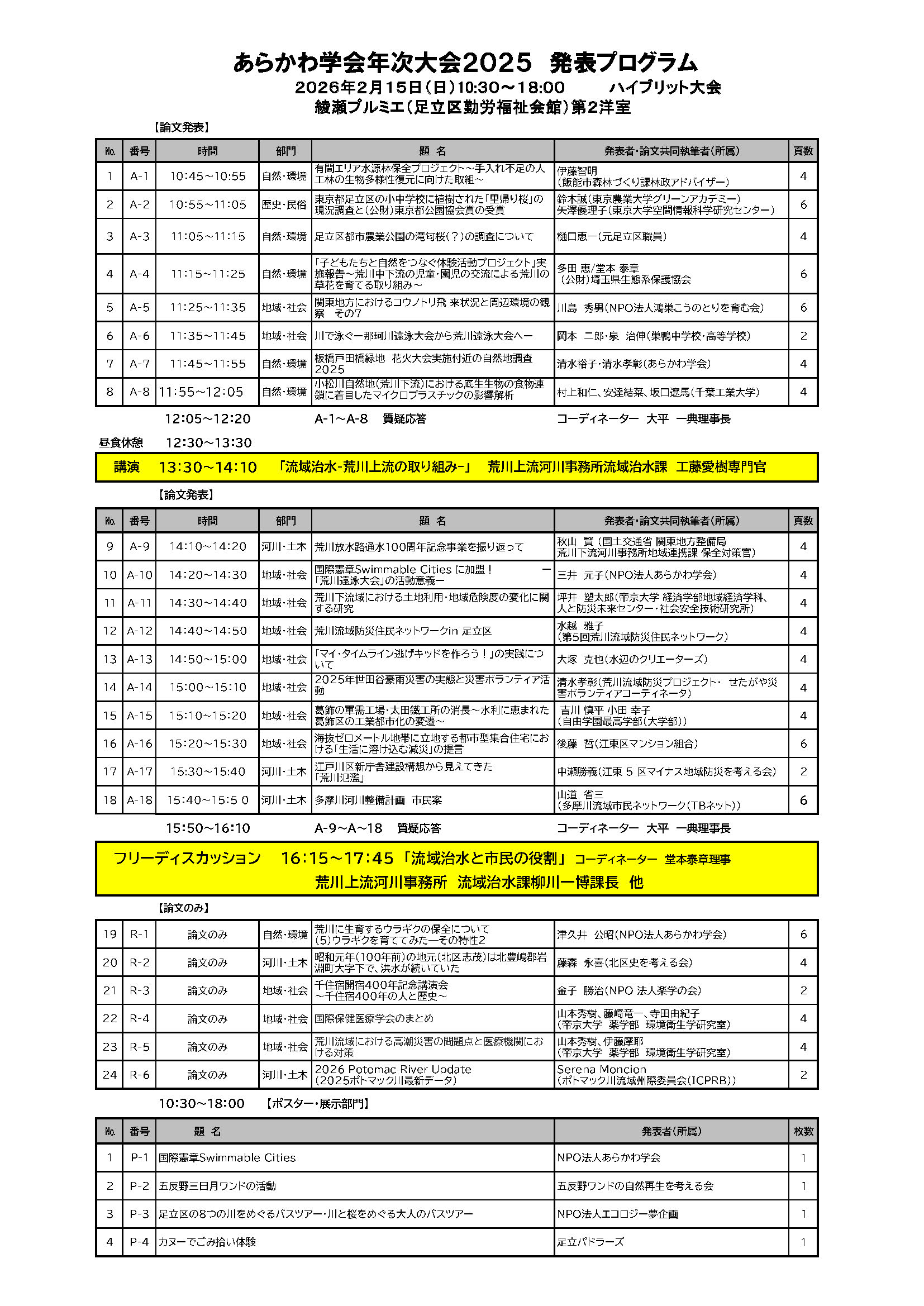 あらかわ学会年次大会プログラム2月15日(日)に行われる第30回記念「年次大会2025」のプログラムが決定しましたのでお知らせします。上流の河川整備計画の進捗について上流河川事務所からお話をうかがい、下流からどんなのことができるのかを考えていきたいと思っています。