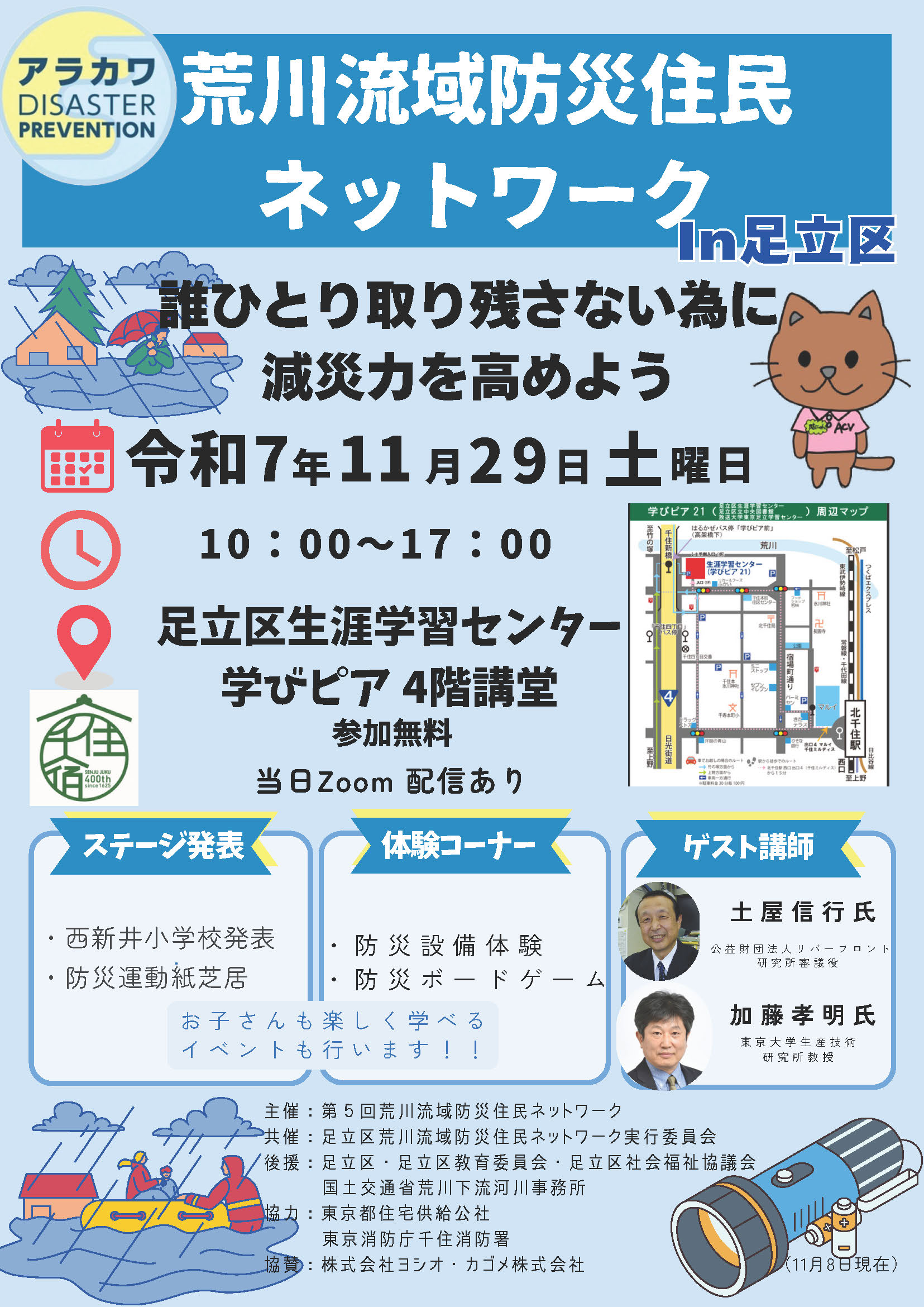 講師としては理事の土屋信行さんも登壇します。足立区立西新井小学校の防災研究発表や防災ボードゲーム、防災体験等盛り沢山です。誰一人取り残さないために流域の住民同士がつながって、減災力を高めようという趣旨で実施します。来年は葛飾区で行われる予定。